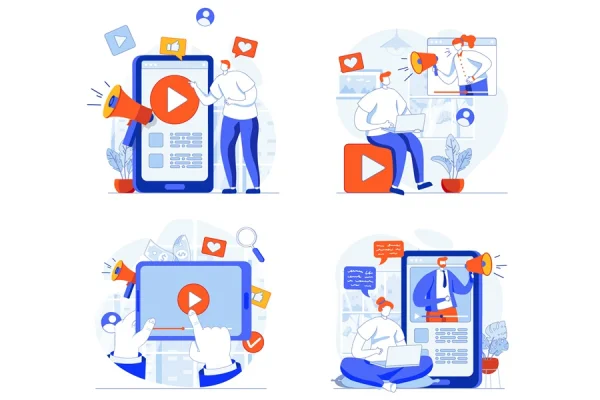 Download: Video marketing concept set. Advertising content creation, video blog promotion. People isolated scenes in flat design. Vector illustration for blogging, website, mobile app, promotional materials.