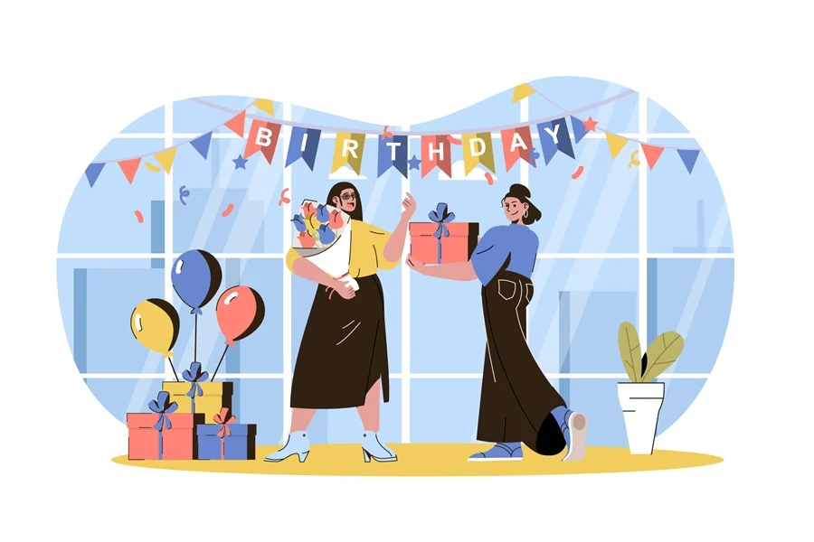 Download: Birthday web character concept. Woman giving gift and bouquet to her friend celebrating holiday at festive party with decor, isolated scene with person. Vector illustration with people in flat design