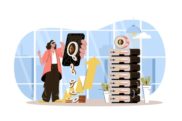 Download: Cryptocurrency mining web character concept. Woman makes digital money on farm, buys or sells bitcoins, crypto business isolated scene with person. Vector illustration with people in flat design