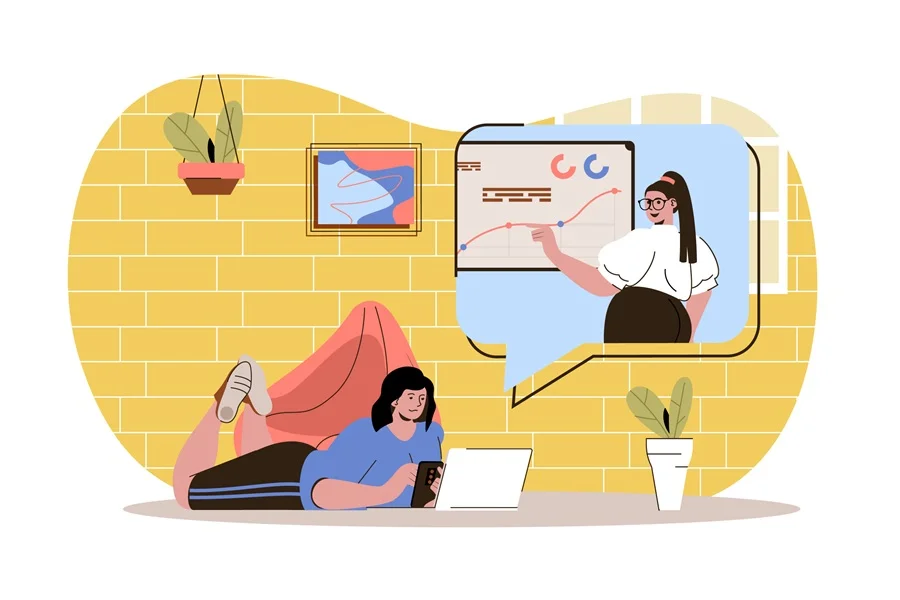 Download: Distant learning web character concept. Student study, watches webinar or video course. E-learning at home, online education isolated scene with persons. Vector illustration with people in flat design