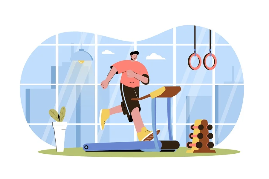 Download: Fitness web character concept. Man running on treadmill. Athlete doing cardio workout in gym, sport exercising at club isolated scene with persons. Vector illustration with people in flat design