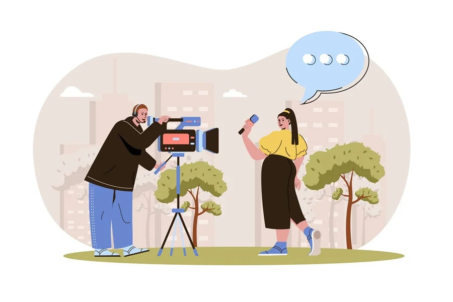 Download: Journalism web character concept. Journalist tells news, operator recording her. Mass media, television news programs isolated scene with persons. Vector illustration with people in flat design