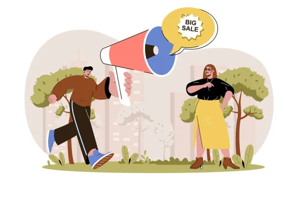 Download: Promotion web character concept. Man with loudspeaker advertises big sale and attracting woman customer to shopping, isolated scene with persons. Vector illustration with people in flat design