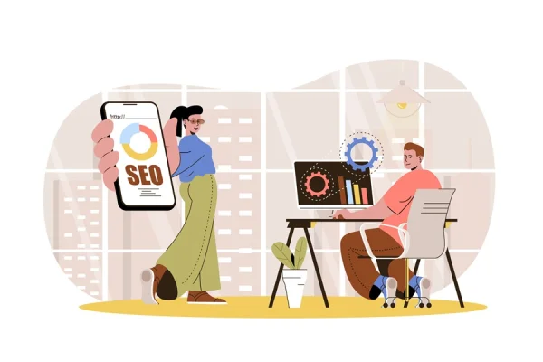Download: Seo optimization web character concept. Marketers team settings search engine, analyzes data, monitoring in mobile app, isolated scene with persons. Vector illustration with people in flat design