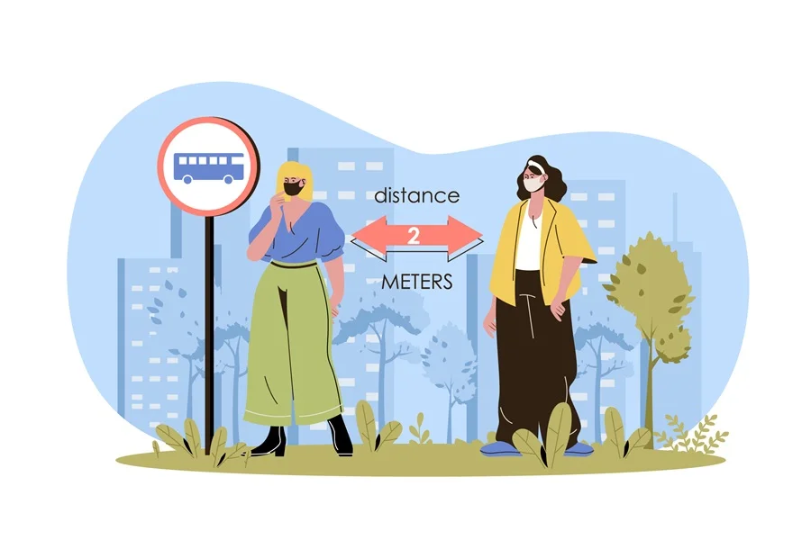 Download: Social distance web character concept. Women in medical masks keep distance standing at bus station, coronavirus prevention isolated scene with persons. Vector illustration with people in flat design