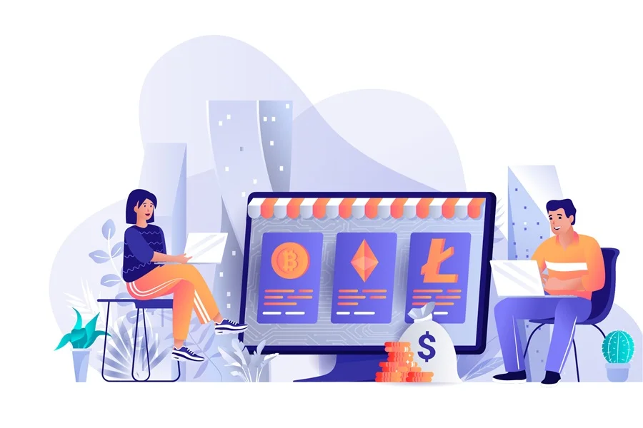Download: Cryptocurrency marketplace concept in flat design. Crypto currency exchange, financial transaction scene template. Man and woman on laptops mining. Vector illustration of people characters activities