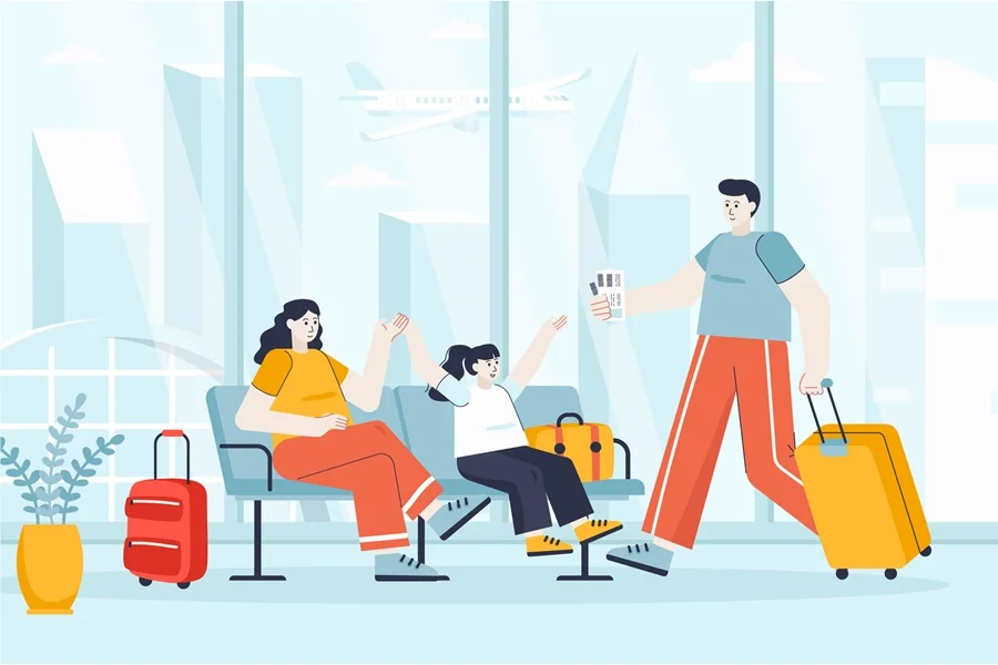 Download: Travel vacation concept in flat design. Family in airport terminal waiting hall scene. Mom, dad and daughter flight on journey together. Vector illustration of people characters for landing page