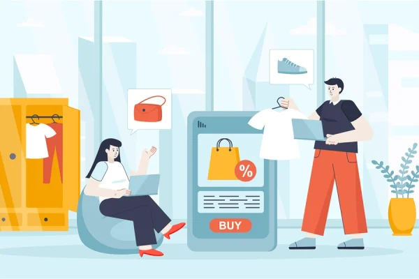 Download: Online shopping concept in flat design. Couple buying clothes on store website scene. Man and woman choose new outfits, pay at mobile app. Vector illustration of people characters for landing page