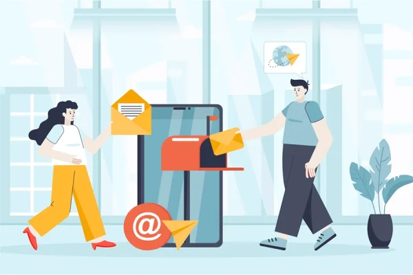 Download: Mobile email service concept in flat design. Colleagues work at office scene. Man and woman sending newsletter, messaging, business marketing. Vector illustration of people characters for landing page