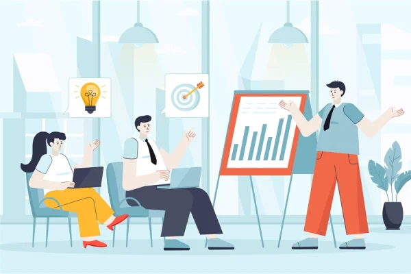 Download: Business training concept in flat design. Colleagues at conference scene. Employees listen to coach, improve qualifications, success career. Vector illustration of people characters for landing page
