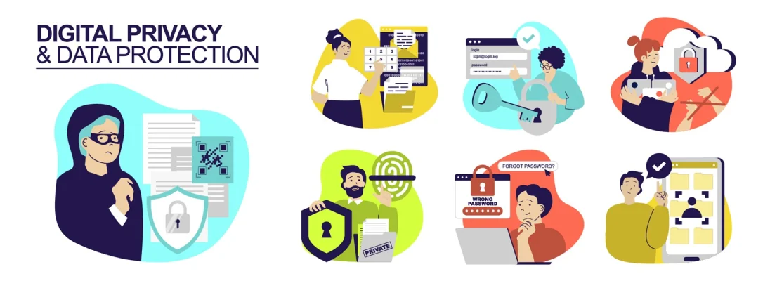 Download: Digital privacy and Data protection concept set for web design. Collection with people using safety access with passwords, protecting personal information from hackers attacks. Vector illustration.