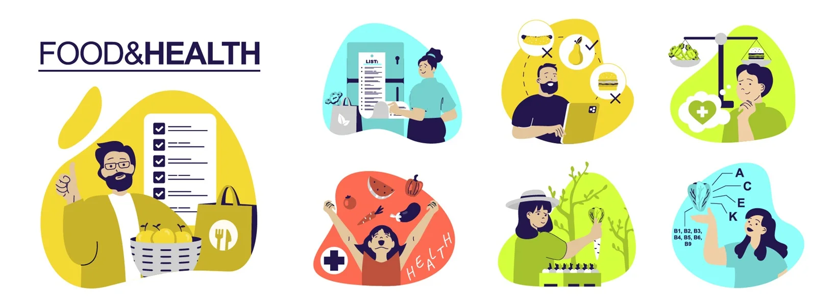 Download: Food and Health concept set for web design. Collection with people planning healthy diet, shopping in grocery stores with lists, choosing meals with fresh vegetables and fruits. Vector illustration.