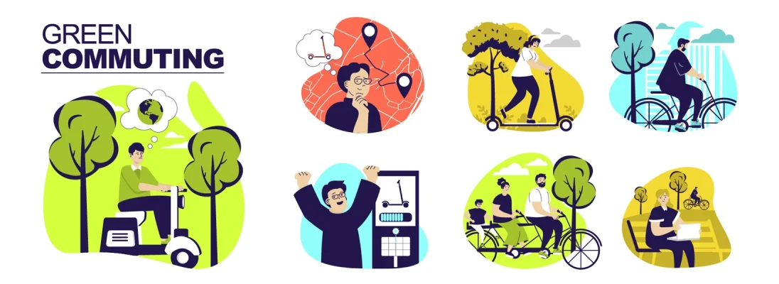 Download: Green commuting concept set for web design. Collection with people riding electric scooters for urban transportation to work, cycling bicycles, planning routes with charge stops. Vector illustration.
