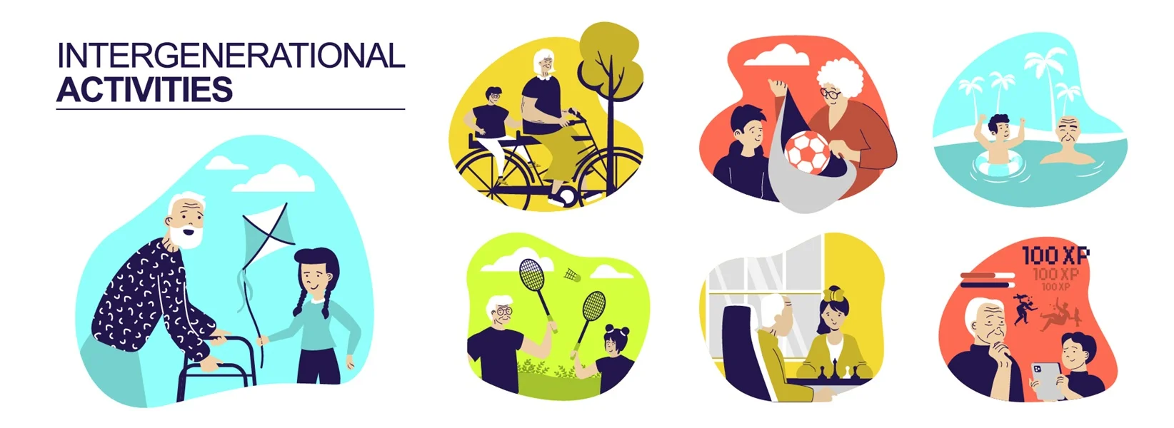 Download: Intergenerational activities concept set for web design. Collection with people pastime together, grandparents playing tennis or football, cycling and swimming with children. Vector illustration.