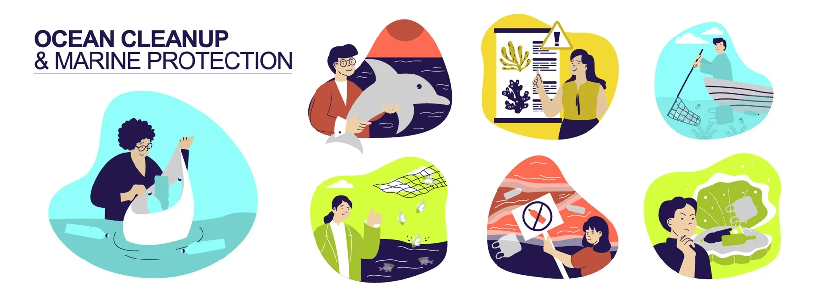 Download: Ocean cleanup and marine protection concept set for web design. Collection with people gathering plastic trash in water, saving dolphins and sea wildlife, environment awareness. Vector illustration.