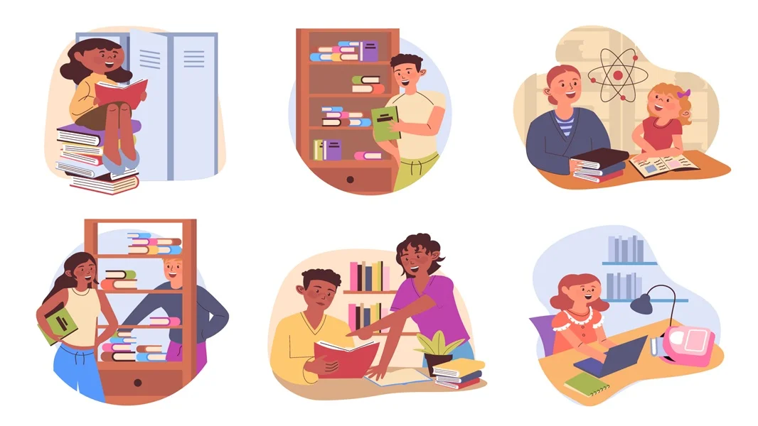 Download: School library time concept set for web design. Collection with cartoon people reading books in class. Pupils and students learning with textbooks, taking folios from shelves. Vector illustration.