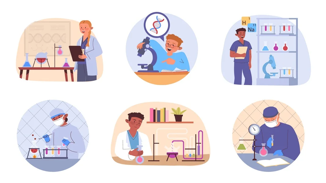 Download: Medical laboratory test concept set for web design. Collection with cartoon people testing patients samples, doing scientific analysis with tubes, flasks, beakers and equipment. Vector illustration.