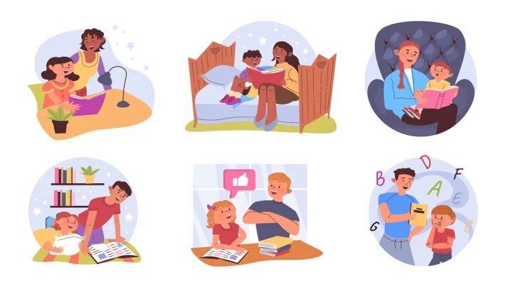 Download: Kids storytelling concept set for web design. Collection with cartoon people reading books with their kids. Parents telling fairy tales, children sitting and listening stories. Vector illustration.