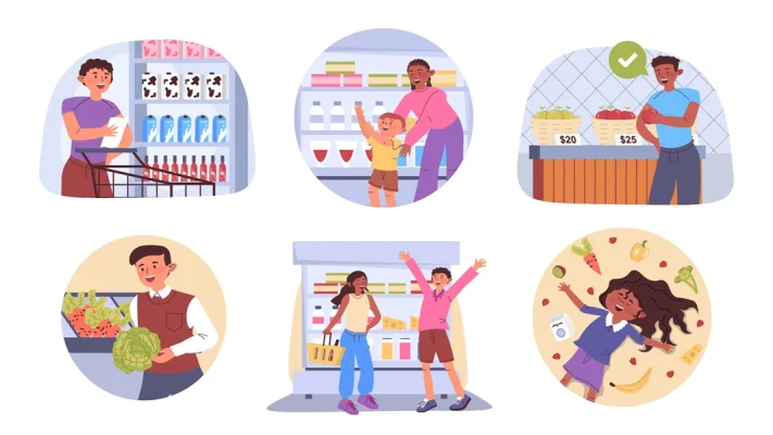 Download: Grocery shopping concept set for web design. Collection with cartoon people doing purchases at supermarket, choosing food products at shelves of different store departments. Vector illustration.