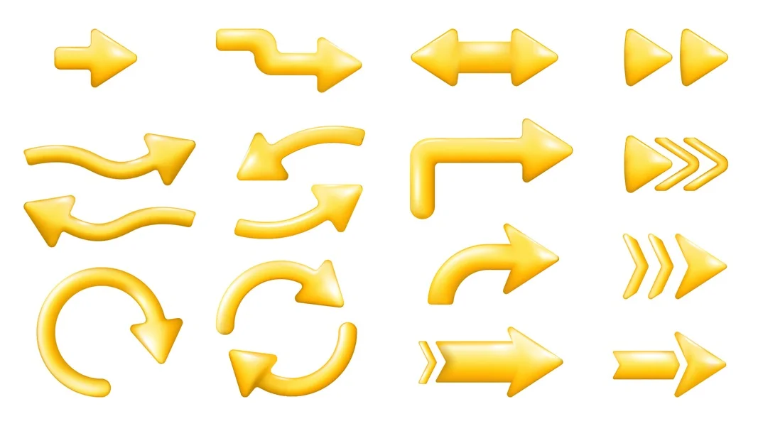 Download: Arrows concept of 3D illustration set for modern web design. Collection with shiny yellow pointers with different directions, buttons of next, download, play, turning, ascending. Vector illustration.
