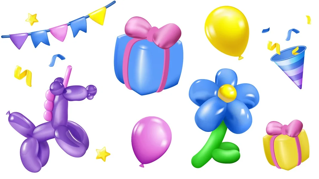 Download: Birthday elements concept of 3D illustration set for modern web design. Collection with glossy colourful flag garlands, inflatable unicorn toy, floating balloons, gifts, flower. Vector illustration.