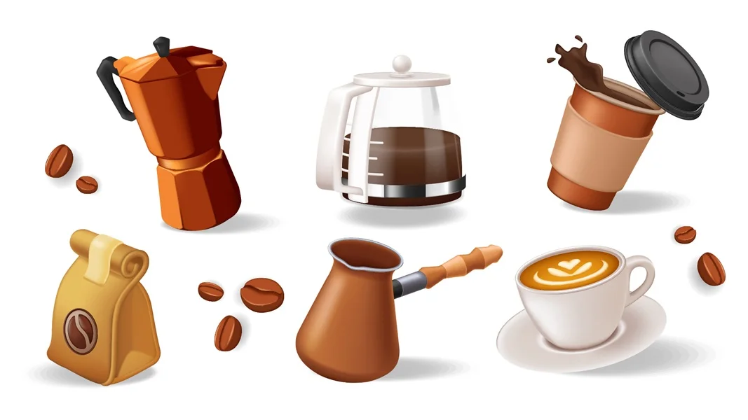 Download: Coffee elements concept of 3D illustration set for modern web design. Collection with coffee brewing pot, brown beans and packaging, paper disposable cup, jezve, latte in mug. Vector illustration.