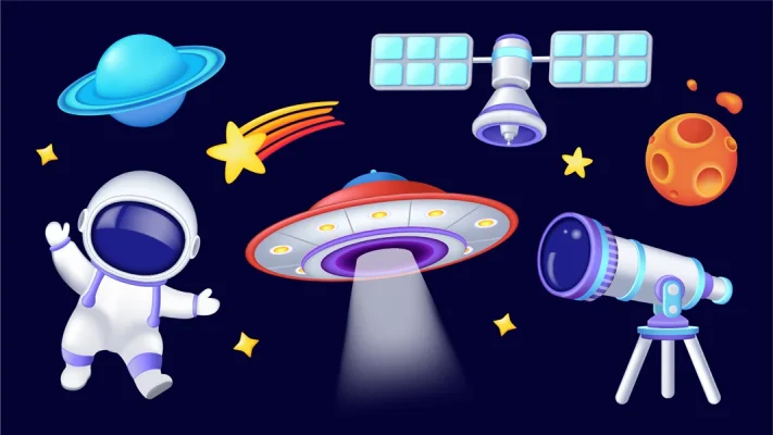 Download: Space elements concept of 3D illustration set for modern web design. Collection with glossy planets, flying star, satellite, moon, astronaut, ufo spacecraft, astronomy telescope. Vector illustration.