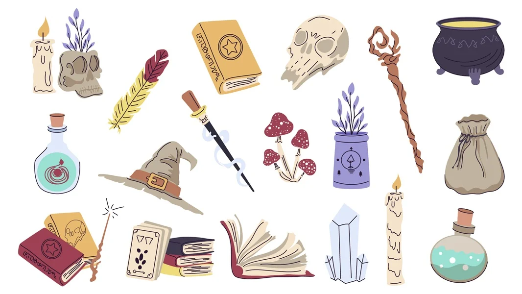 Download: Witchcraft elements set design. Collection with candles, skulls, spell books, witch cauldron, magic wand, magician hat, fly agaric, plants, potions, tarot cards, more items. Vector illustration.