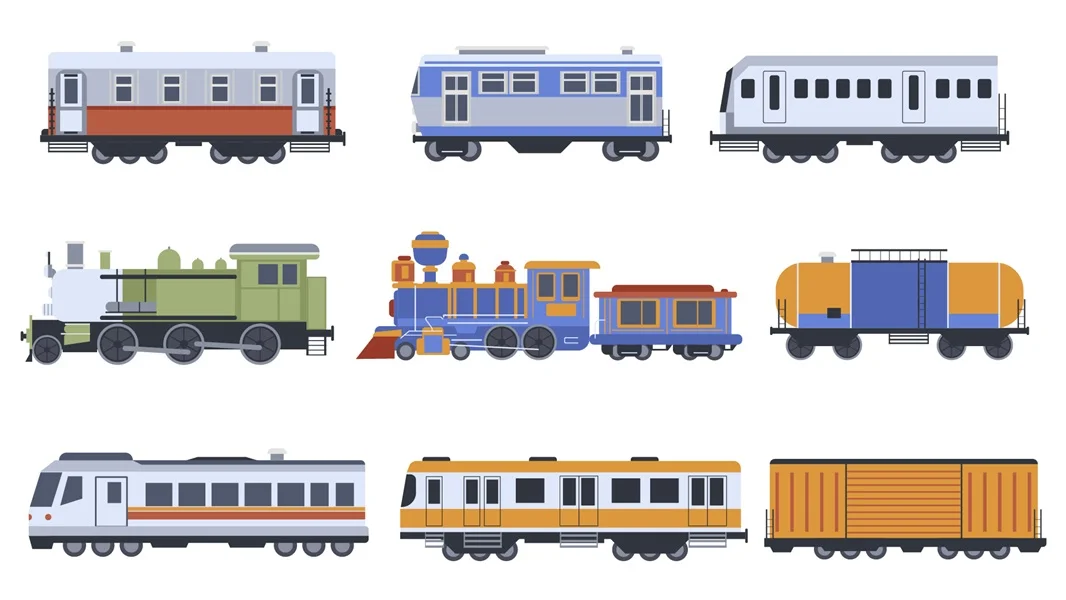 Download: Trains elements set design. Collection with modern and vintage transport, locomotives, freight cars and passenger trains, subway wagons, rail transport vehicles and carriages. Vector illustration.