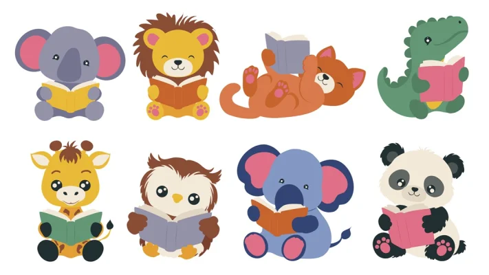 Download: Animals reading books elements set design. Collection with cute elephant, lion, cat, dinosaur, giraffe, owl and panda holding open books, read tales or story, learning literacy. Vector illustration.