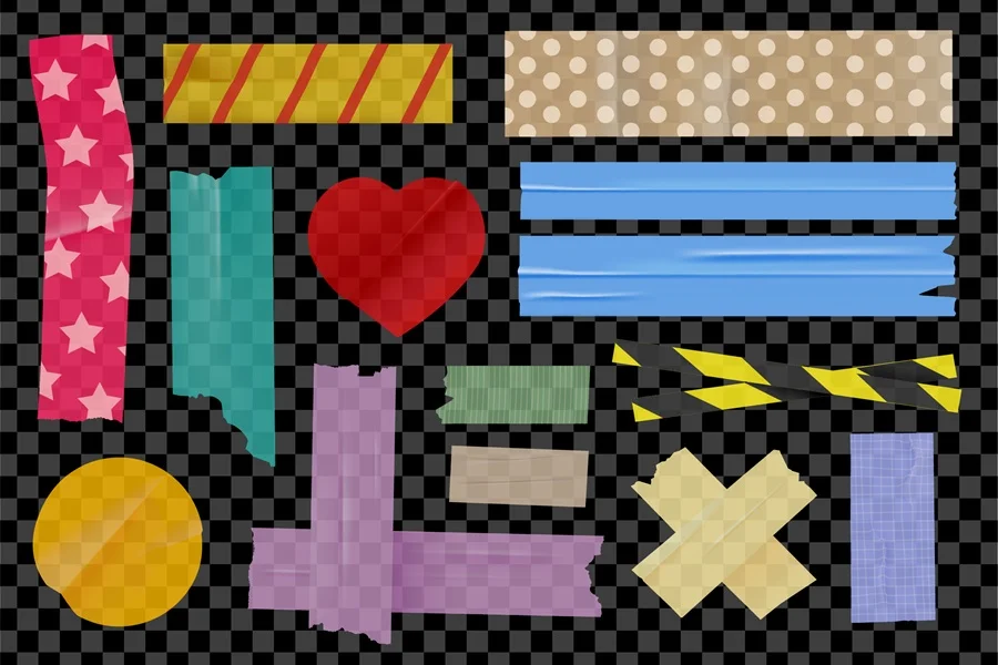 Download: Tape stickers elements set design. Collection with colourful sticky scotch tapes with torn edges, transparent glued round and heart shapes templates and cross overlay ribbons. Vector illustration.