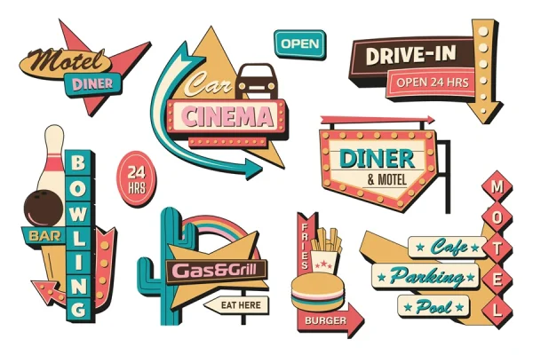 Download: Retro signs elements set design. Collection with colourful 50s, 70s signboards for motels with dinner, car cinema, open, drive and hotel, bowling, bar, grill, cafe and others. Vector illustration.