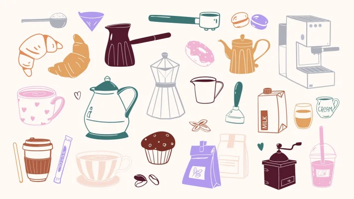Download: Hand drawn doodle sketch coffee clipart elements set design. Collection with moka pot, croissants, grains in bag, espresso maker machine, cups, kettles, sugar sticks, milk, more. Vector illustration.