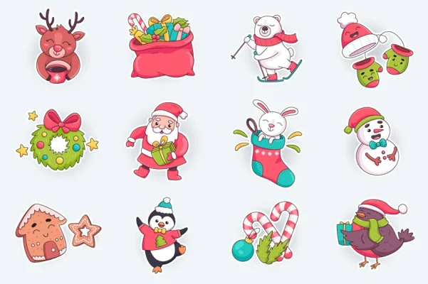 Download: Christmas cute stickers set in flat cartoon design. Happy reindeer drinks cocoa, bag of gifts, polar bear on skis, Santa Claus, wreath and other. Vector illustration for planner or organizer template.