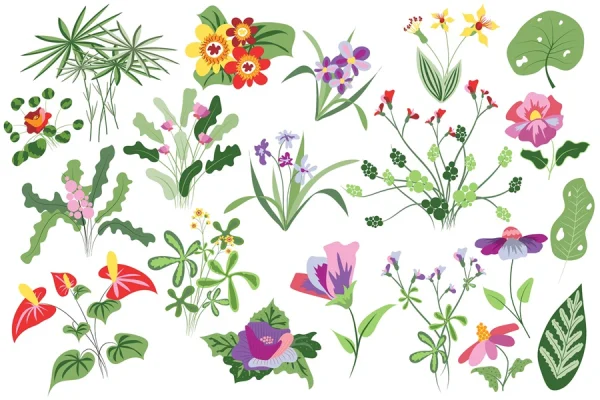 Download: Flower and plants isolated set. Flowering and blooming wildflowers, greenery, wild foliage and other. Summer botanical decor. Bundle of floral elements. Vector illustration in hand drawn design.