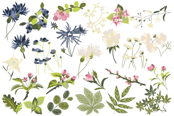Download: Flower and plants isolated set. Flowering garden and blooming wildflowers different types. Green leaves, beautiful herbs and other. Bundle of floral elements. Vector illustration in hand drawn design.