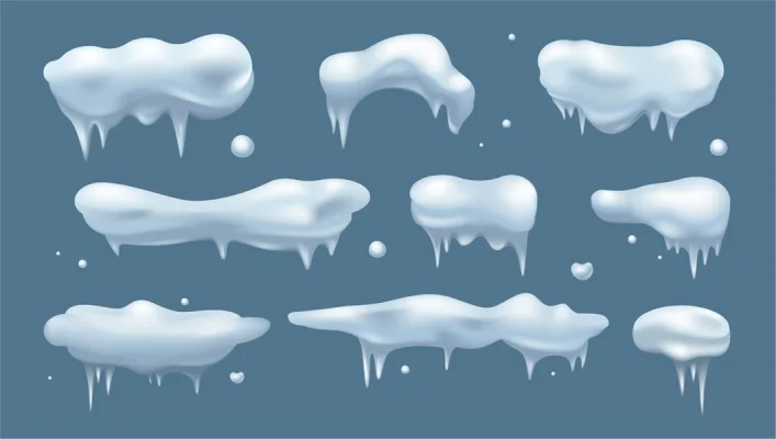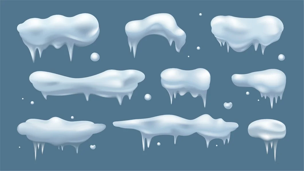Download: Snow caps 3d elements set in realistic render design. Collection of white horizontal snow piles and corners with melts and icicles, frost winter roof borders and snowy frames. Vector illustration.