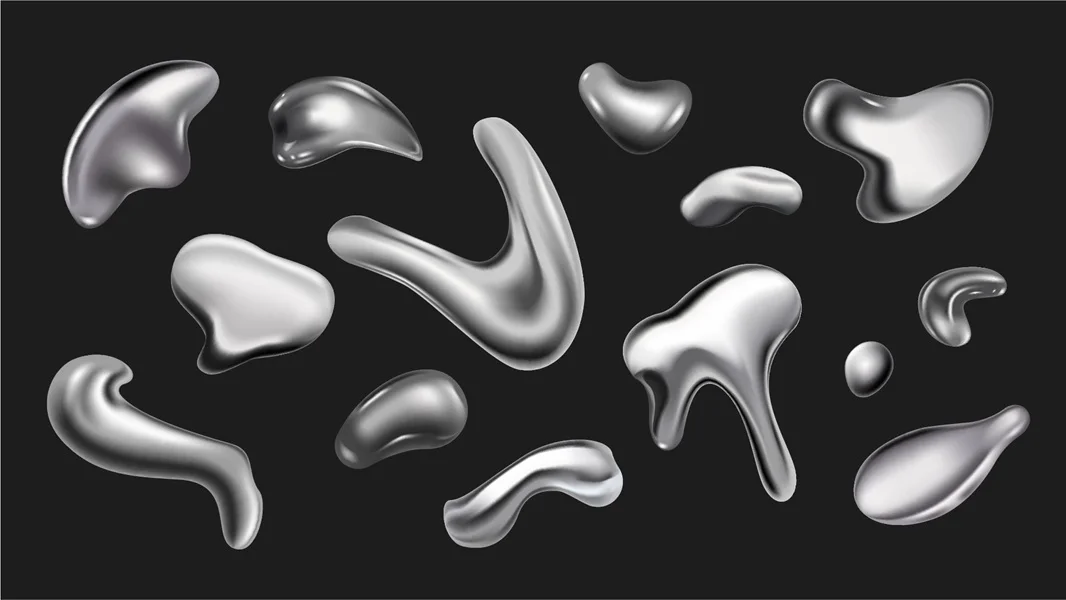 Download: Silver liquid shapes 3d elements set in realistic render design. Collection of glossy chrome liquid blobs, shiny metallic fluid with glass reflectives, mercury pouring effect. Vector illustration.