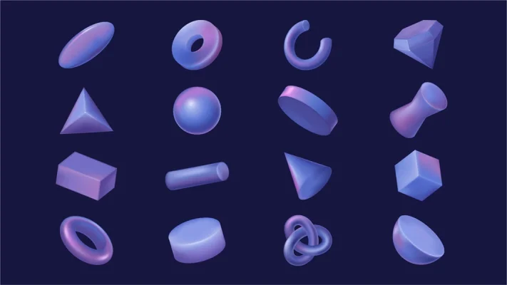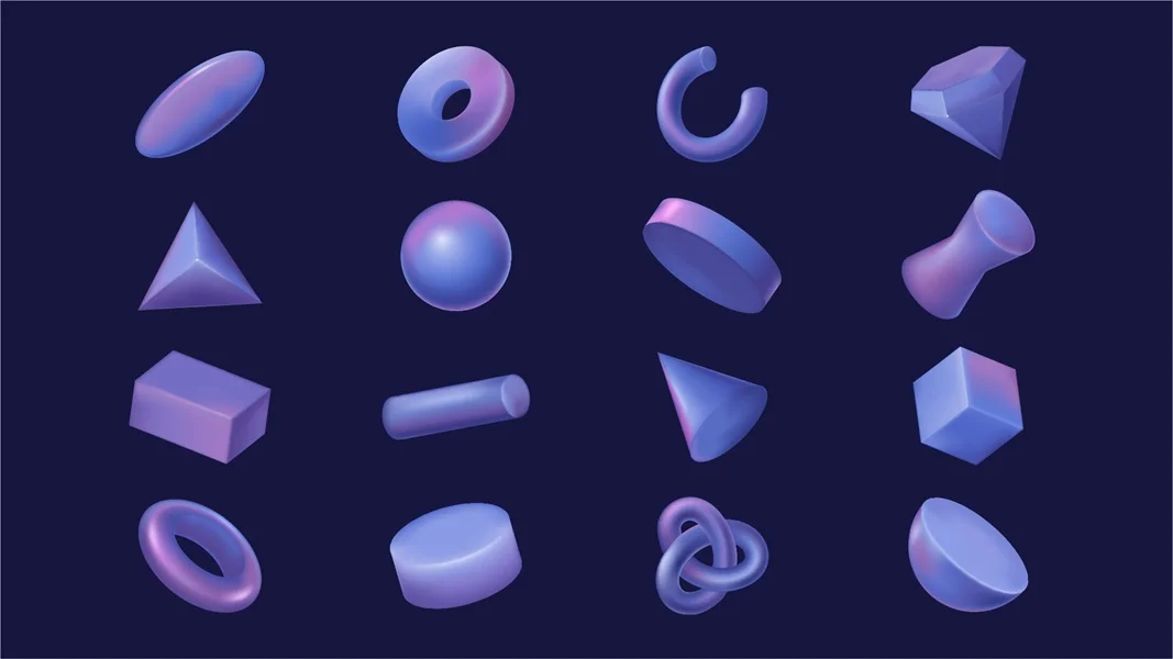 Download: Geometric shapes 3d elements set in realistic render design. Collection of oval, donut, spiral part, diamond, pyramid, sphere, circle, cube, cone, chain, ring, torus, half figure. Vector illustration.