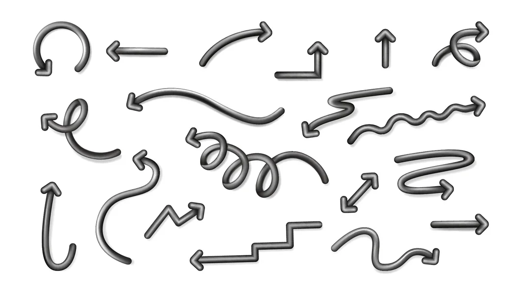 Download: Arrows 3d elements set in realistic render design. Collection of glossy black long or short pointers with turn, swirl, curl, rotation, zigzag, wavy, circular and other directions. Vector illustration.
