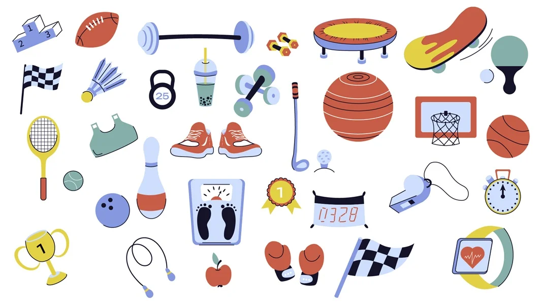 Download: Sport equipment graphic elements set. Collection of ball, barbell, dumbbell, trampoline, skateboard, tennis racket, flag, sneakers, basketball hoop, kettlebell, stopwatch, more. Vector illustration.