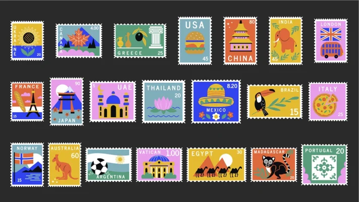 Download: Post stamps graphic elements set. Collection of Ukraine, Canada, Greece, USA, China, India, France, Japan, UAE, Thailand, Mexico, Brazil, Italy, Norway, Australia, more countries. Vector illustration.