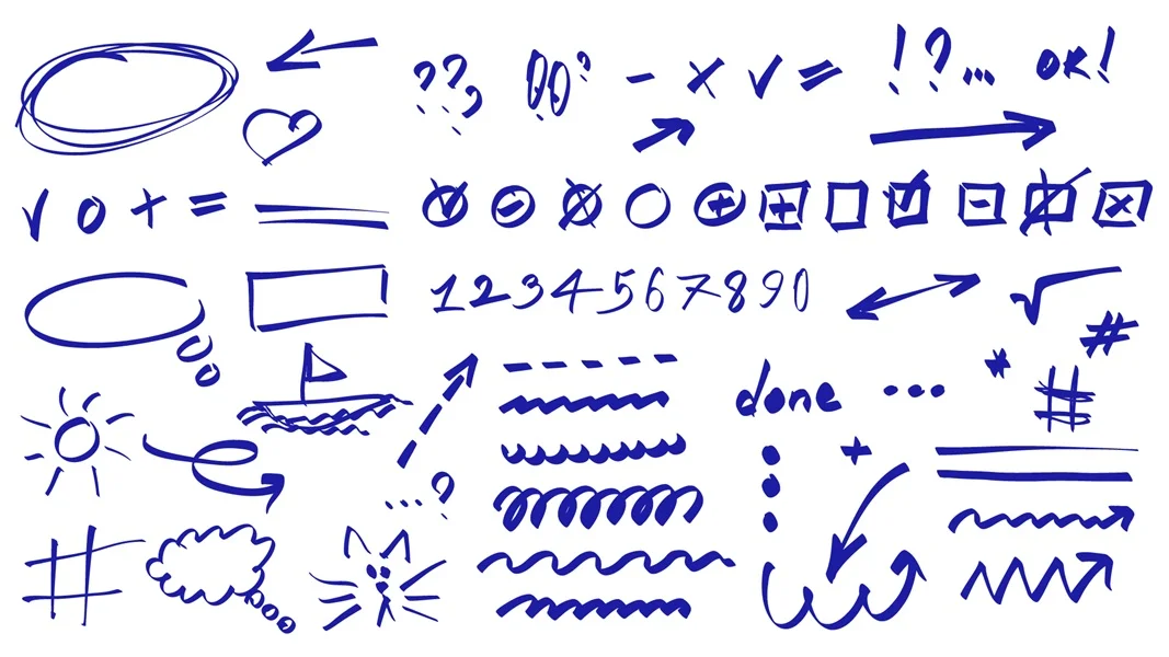 Download: Note doodles graphic elements set. Collection of blue hand drawn scribbles with arrows, frames, heart question, mark, highlights, lines, circles, swirls, ticks, done, cat, more. Vector illustration.
