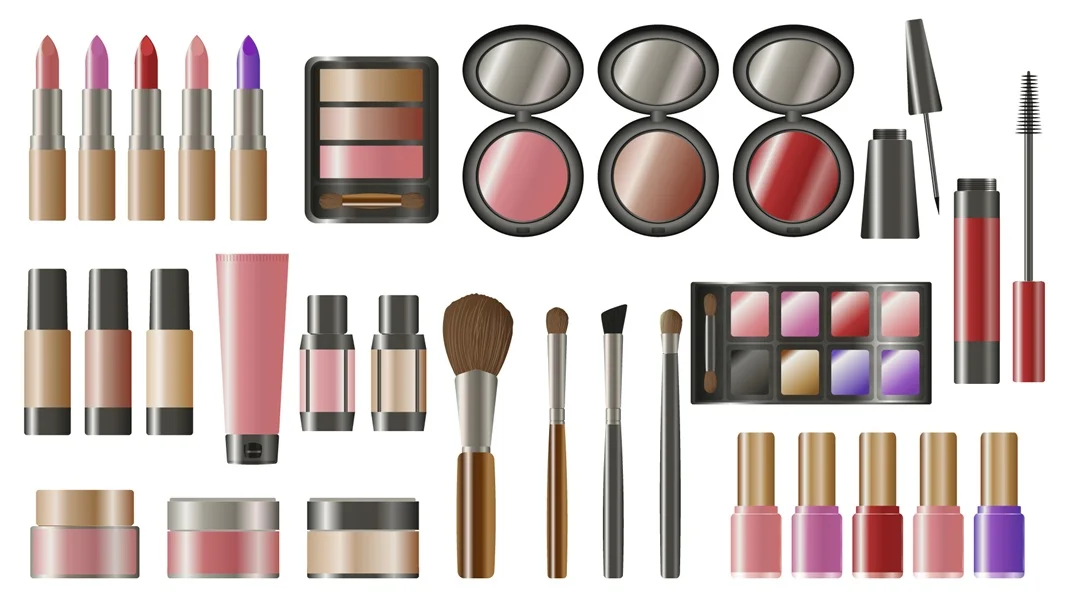 Download: Cosmetics makeup with different color swatches graphic elements set. Collection of lipsticks, blush, eyeshadow palette, mascara, brushes, nail polishes, skin foundations, more. Vector illustration.