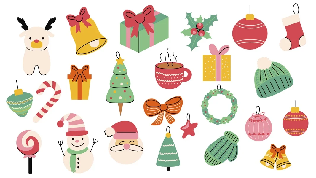 Download: Christmas graphic elements set. Collection of reindeer, bell, gift box, holly, toy ball, stocking, candy cane, tree, cacao cup, hat, snowman, Santa Claus, bow, star, wreath, more. Vector illustration.