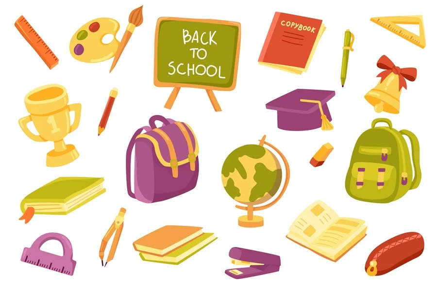 Download: School supply cute stickers isolated set. Collection of ruler, paints, chalkboard, notebook, pen, pencil, backpack, globe, textbook, compasses, stapler. Vector illustration in flat cartoon design.